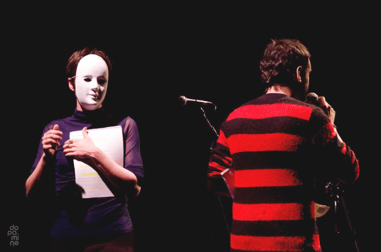 Para finalizar con ese otro tan conocido del público donde el confuso poema consumista recitado de una trepidante macedonia de marcas comerciales (y algo más) hace que el público se retuerza de risa (y algo más) en sus asientos. A continuación, una provocativa sesión de terapia psicológica gratuita a cargo de otro polipoético invitado. Breve –como el propio X anticipó- pero intensa. Con movimientos expansivos que iban de la RE –presión a la EX presión, por ejemplo. Y, sin saber por qué, recordaban a ciertos ejercicios preparatorios a que son sometidos los políticos. Le tocó después el turno a nuestro amigo, el Dr. Diávolo, que acompañaba el recitado de temas que hablaban de soledad, alienación y asombro ante el inmoral caos urbano y social, con una actitud inusitadamente tierna. La actuación de la joven poeta invitada gallega estuvo correcta, trazando vueltas sobre un imaginario carrillón, al tiempo que acompañaba sus evoluciones de progresivos recitados.